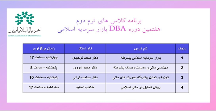 برنامهی کلاسهای ترم دوم هفتمین دوره DBA بازار سرمایه اسلامی انجمن
