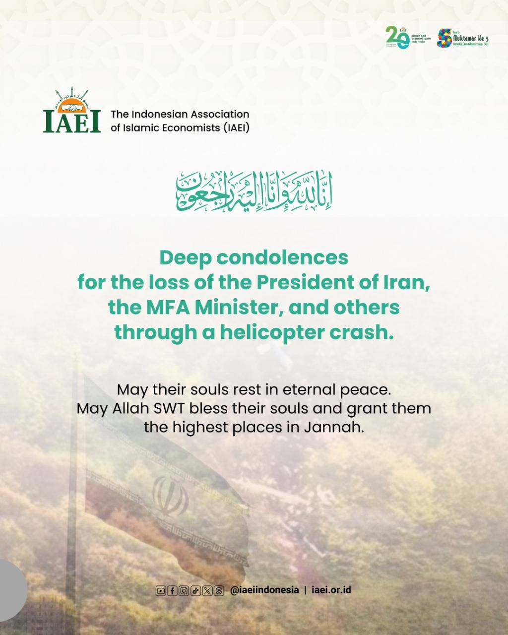 انجمن اقتصاددانان اسلامی اندونزی به دنبال سانحه سقوط بالگرد و شهادت رییس جمهوری ایران, آیت الله سید ابراهیم رییسی و دیگران همراهان ایشان پیام تسلیت ارسال کرد.