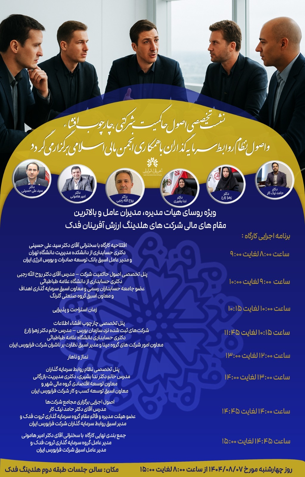 کارگاه تخصصی «اصول حاکمیت شرکتی، چارچوب افشا و اصول نظام روابط سرمایهگذاران» با همکاری انجمن مالی اسلامی ایران و گروه سرمایهگذاری ثروت فدک در تاریخ ۷ آبان ماه ۱۴۰۴ برگزار شد.