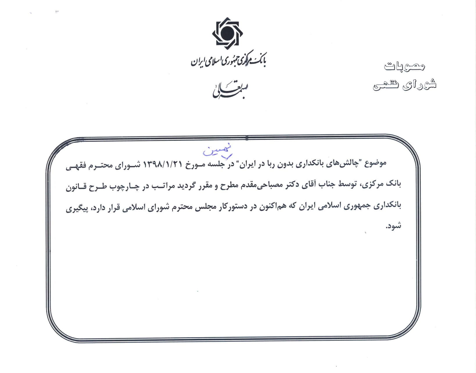 موضوع «چالشهای بانکداری بدون ربا در ایران» در نهمین جلسه مورخ 1398/1/21 شورای محترم فقهی بانک مرکزی، توسط جناب آقای دکتر مصباحیمقدم مطرح و مقرر گردید مراتب در چارچوب طرح قانون بانکداری جمهوری اسلامی ایران که هماکنون در دستور کار مجلس محترم شورای اسلامی قرار دارد، پیگیری شود.